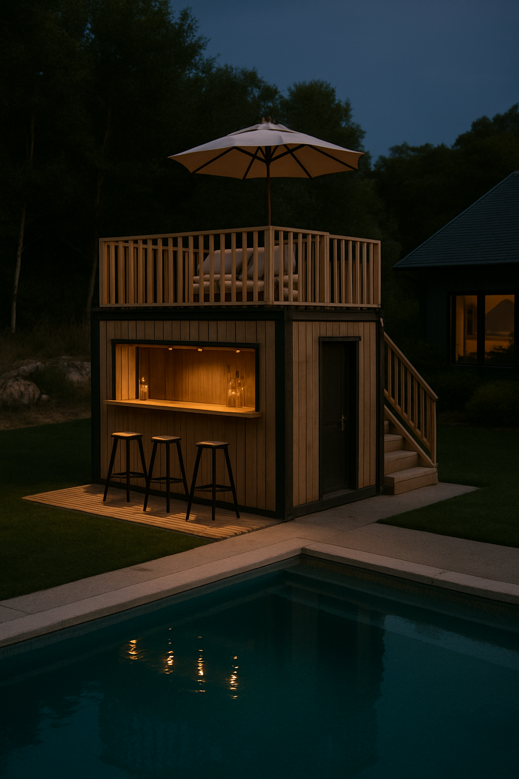 Why a container bar works in NZ: dedicated entertaining zone, proper serving space, and lighting so the evening continues even when the sun goes down.